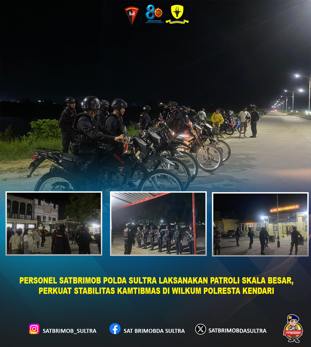 Dalam rangka menjaga dan memastikan situasi keamanan dan ketertiban masyarakat (kamtibmas) tetap kondusif, personel Satuan Brigade Mobil (Satbrimob) Polda Sulawesi Tenggara melaksanakan kegiatan patroli skala besar di wilayah hukum Polresta Kendari, pada waktu dan titik-titik strategis yang telah ditentukan.