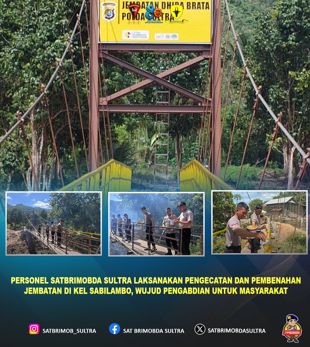 Personel Satuan Brigade Mobil Kepolisian Daerah Sulawesi Tenggara (Satbrimob Polda Sultra) kembali menunjukkan komitmennya dalam mendukung pembangunan infrastruktur dan kesejahteraan masyarakat melalui kegiatan pengecatan serta pembenahan jembatan yang berlokasi di Kelurahan Sabilambo, Kabupaten Kolaka.