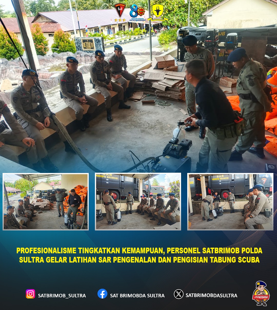 Dalam rangka meningkatkan kemampuan dan kesiapsiagaan di bidang Search and Rescue (SAR), personel Satuan Brimob Polda Sulawesi Tenggara melaksanakan kegiatan latihan pengenalan alat mesin kompresor tabung scuba serta tata cara pengisian tabung scuba secara benar dan aman.
