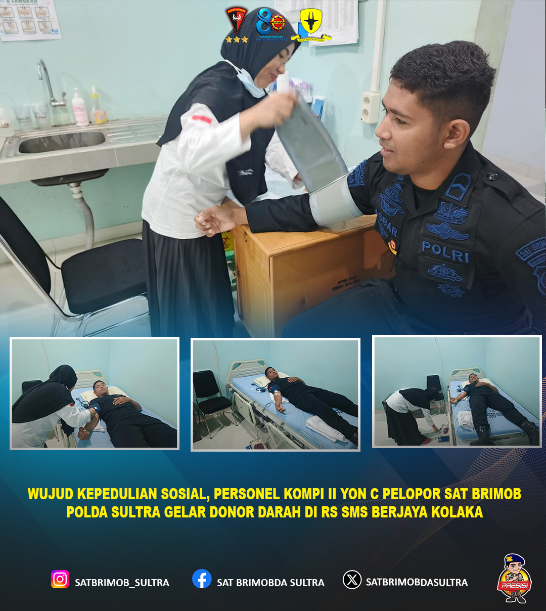 Dalam rangka meningkatkan kepedulian sosial serta membantu masyarakat yang membutuhkan, personel Kompi II Batalyon C Pelopor Satuan Brimob Polda Sulawesi Tenggara melaksanakan kegiatan donor darah di Rumah Sakit SMS Berjaya Kolaka.